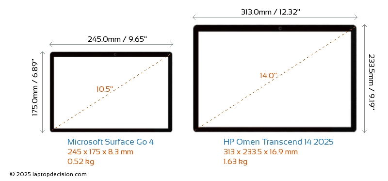 HDMI Omen Transcend 14 2025 cuenta con un puerto HDMI (1x HDMI 2.1) para conectar a monitores externos. Surface Go 4 no tiene puerto HDMI.