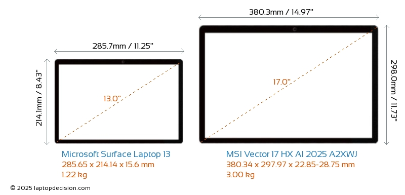 HDMI Vector 17 HX AI 2025 A2XWJ cuenta con un puerto HDMI (1x HDMI 2.1) para conectar a monitores externos. Surface Laptop 13 no tiene puerto HDMI.