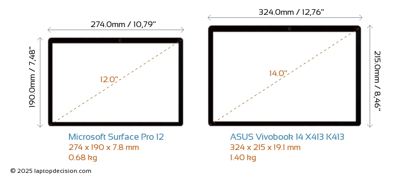 HDMIVivobook 14 X413 K413 cuenta con un puerto HDMI (1x HDMI 1.4) para conectar a monitores externos. Surface Pro 12 no tiene puerto HDMI.