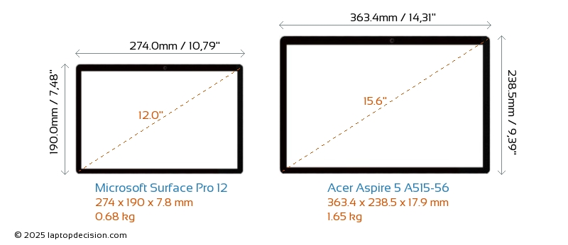 HDMIAspire 5 A515-56 cuenta con un puerto HDMI (1x HDMI 1.4) para conectar a monitores externos. Surface Pro 12 no tiene puerto HDMI.