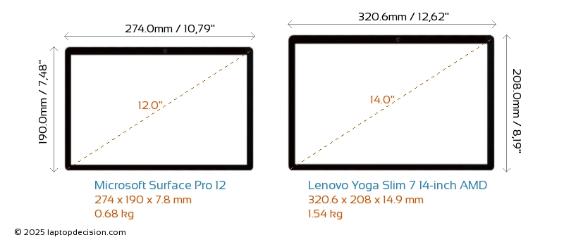 HDMIYoga Slim 7 14-inch AMD cuenta con un puerto HDMI (1x HDMI 2.0) para conectar a monitores externos. Surface Pro 12 no tiene puerto HDMI.