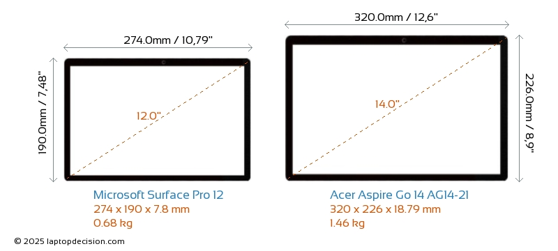 HDMI Aspire Go 14 AG14-21 cuenta con un puerto HDMI (1x HDMI 1.4) para conectar a monitores externos. Surface Pro 12 no tiene puerto HDMI.