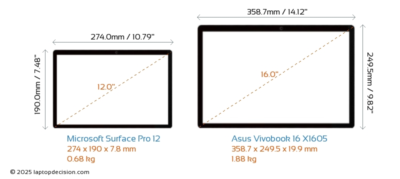 HDMI Vivobook 16 X1605 cuenta con un puerto HDMI (1x HDMI 1.4) para conectar a monitores externos. Surface Pro 12 no tiene puerto HDMI.