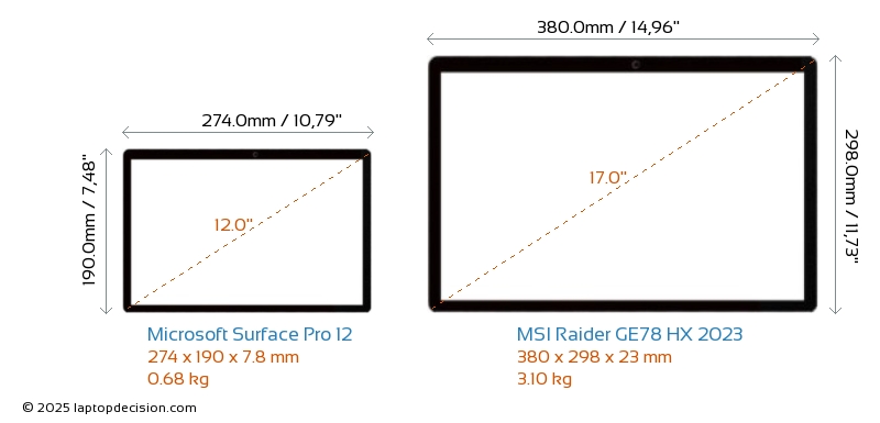 HDMI Raider GE78 HX 2023 cuenta con un puerto HDMI (1x HDMI 2.1) para conectar a monitores externos. Surface Pro 12 no tiene puerto HDMI.