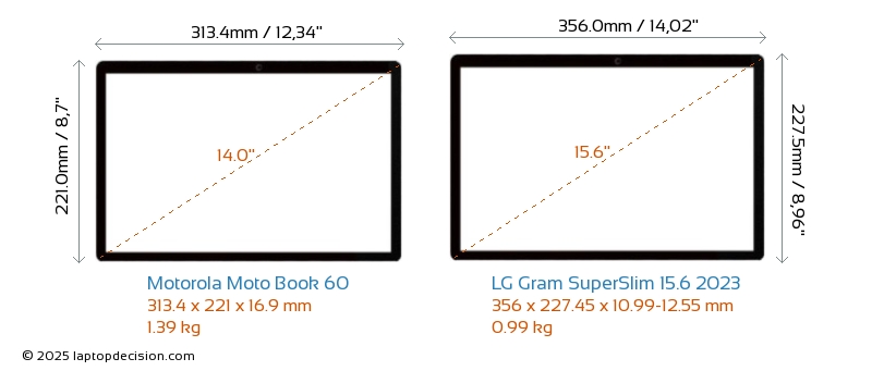 HDMI Moto Book 60 cuenta con un puerto HDMI (1x HDMI 1.4) para conectar a monitores externos. Gram SuperSlim 15.6 2023 no tiene puerto HDMI.