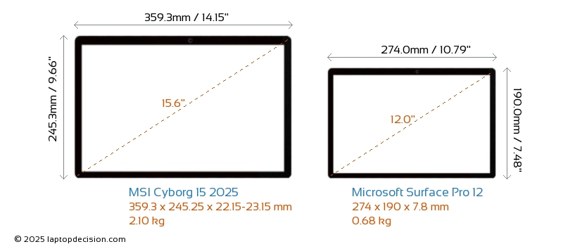 HDMI Cyborg 15 2025 cuenta con un puerto HDMI (1x HDMI 2.1) para conectar a monitores externos. Surface Pro 12 no tiene puerto HDMI.