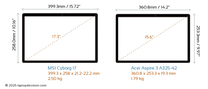 USBAmbos Cyborg 17 y Aspire 3 A325-42 cuentan con 2x USB 3.2 puertos USB-A.Ambos Cyborg 17 y Aspire 3 A325-42 tienen puertos USB Type-C. Cyborg 17 tiene 1x USB 3.2 puertos USB Type-C, mientras que Aspire 3 A325-42 tiene 2x USB 3.2 puertos USB Type-C.