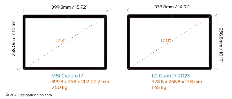 USBAmbos Cyborg 17 y Gram 17 2023 cuentan con 2x USB 3.2 puertos USB-A.Ambos Cyborg 17 y Gram 17 2023 tienen puertos USB Type-C. Cyborg 17 tiene 1x USB 3.2 puertos USB Type-C, mientras que Gram 17 2023 tiene 2x USB 4.0 puertos USB Type-C.