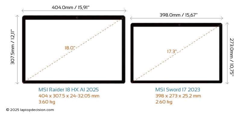USBAmbos Raider 18 HX AI 2025 y Sword 17 2023 cuentan con 3x USB 3.2 puertos USB-A.Ambos Raider 18 HX AI 2025 y Sword 17 2023 tienen puertos USB Type-C. Raider 18 HX AI 2025 tiene 2x USB 4.0 puertos USB Type-C, mientras que Sword 17 2023 tiene 1x USB 3.2 puertos USB Type-C.