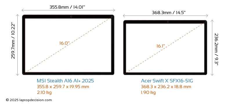 USBAmbos Stealth A16 AI+ 2025 y Swift X SFX16-51G cuentan con 2x USB 3.2 puertos USB-A.Ambos Stealth A16 AI+ 2025 y Swift X SFX16-51G cuentan con 1x USB 4.0 puertos USB Type-C.