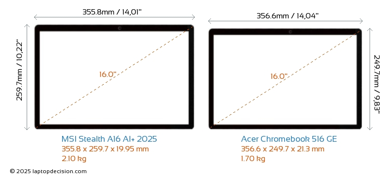 HDMIAmbos Stealth A16 AI+ 2025 y Chromebook 516 GE cuentan con un puerto HDMI. Stealth A16 AI+ 2025 ofrece 1x HDMI 2.1, mientras que Chromebook 516 GE ofrece 1x HDMI 1.4.