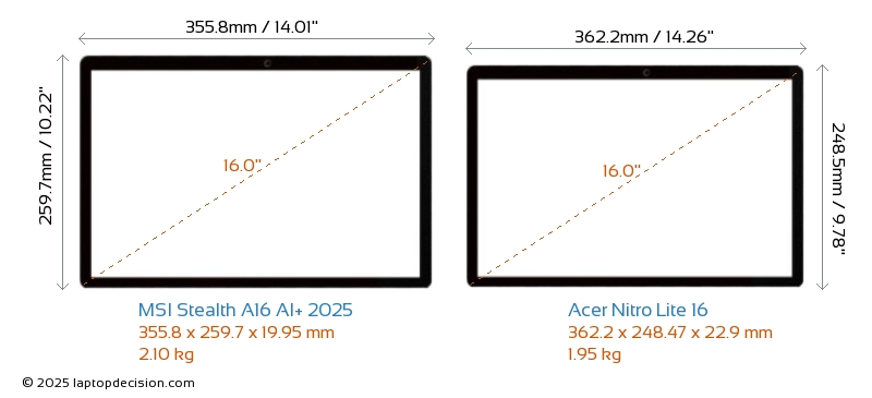USBAmbos Stealth A16 AI+ 2025 y Nitro Lite 16 cuentan con 2x USB 3.2 puertos USB-A.Ambos Stealth A16 AI+ 2025 y Nitro Lite 16 cuentan con 1x USB 4.0 puertos USB Type-C.