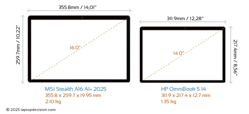 HDMI Stealth A16 AI+ 2025 cuenta con un puerto HDMI (1x HDMI 2.1) para conectar a monitores externos. OmniBook 5 14 no tiene puerto HDMI.