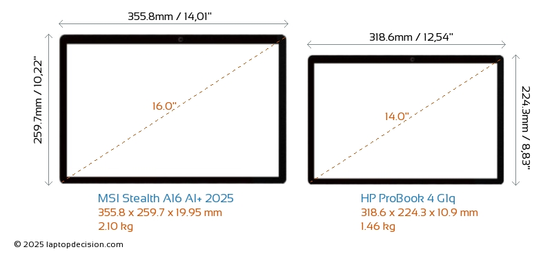 HDMIAmbos Stealth A16 AI+ 2025 y ProBook 4 G1q cuentan con un puerto HDMI (1x HDMI 2.1) para conectar a monitores externos.