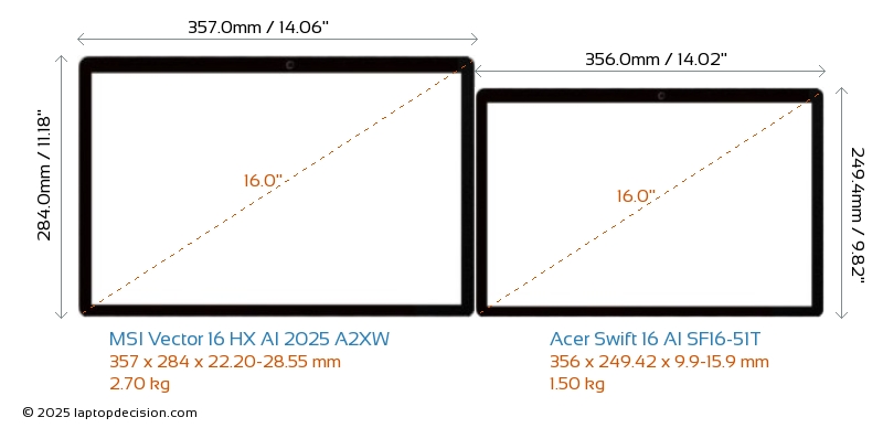 USBAmbos Vector 16 HX AI 2025 A2XW y Swift 16 AI SF16-51T cuentan con 2x USB 3.2 puertos USB-A.Ambos Vector 16 HX AI 2025 A2XW y Swift 16 AI SF16-51T cuentan con 2x USB 4.0 puertos USB Type-C.