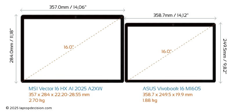 Thunderbolt Vector 16 HX AI 2025 A2XW está equipado con un puerto Thunderbolt 5. Vivobook 16 M1605 no tiene puerto Thunderbolt.