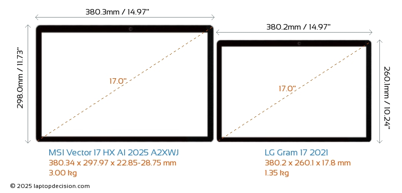 HDMIAmbos Vector 17 HX AI 2025 A2XWJ y Gram 17 2021 cuentan con un puerto HDMI. Vector 17 HX AI 2025 A2XWJ ofrece 1x HDMI 2.1, mientras que Gram 17 2021 ofrece 1x HDMI 2.0.