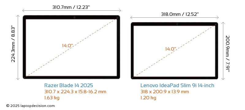 HDMI Blade 14 2025 cuenta con un puerto HDMI (1x HDMI 2.1) para conectar a monitores externos. IdeaPad Slim 9i 14-inch no tiene puerto HDMI.