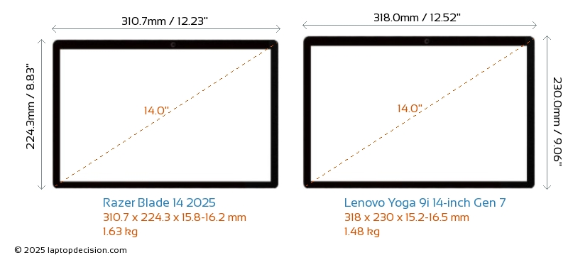 ThunderboltYoga 9i 14-inch Gen 7 está equipado con un puerto Thunderbolt 4. Blade 14 2025 no tiene puerto Thunderbolt.