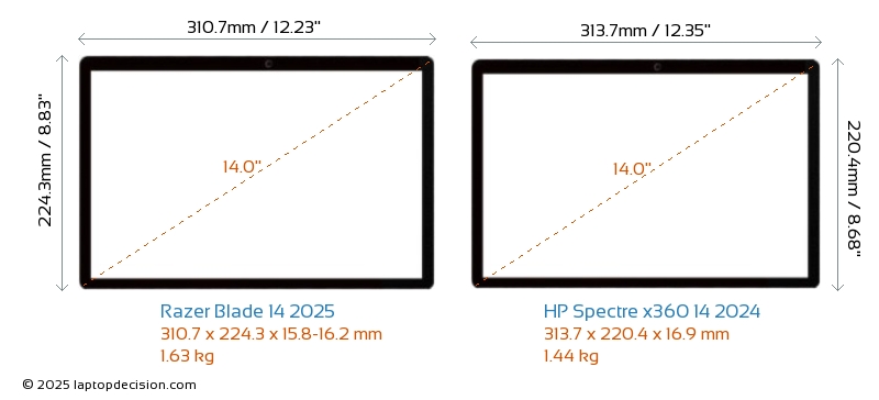 HDMI Blade 14 2025 cuenta con un puerto HDMI (1x HDMI 2.1) para conectar a monitores externos. Spectre x360 14 2024 no tiene puerto HDMI.