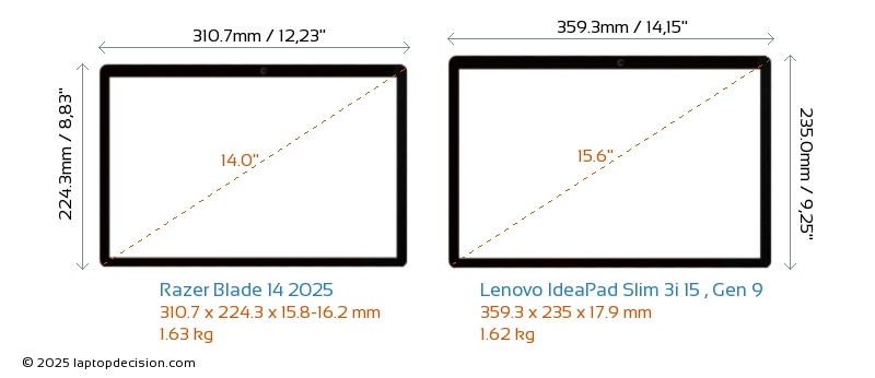 USBAmbos Blade 14 2025 y IdeaPad Slim 3i 15 , Gen 9 cuentan con 2x USB 3.2 puertos USB-A.Ambos Blade 14 2025 y IdeaPad Slim 3i 15 , Gen 9 tienen puertos USB Type-C. Blade 14 2025 tiene 2x USB 4.0 puertos USB Type-C, mientras que IdeaPad Slim 3i 15 , Gen 9 tiene 1x USB 3.2 puertos USB Type-C.
