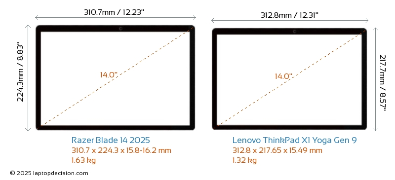 USBAmbos Blade 14 2025 y ThinkPad X1 Yoga Gen 9 cuentan con 2x USB 3.2 puertos USB-A.Ambos Blade 14 2025 y ThinkPad X1 Yoga Gen 9 cuentan con 2x USB 4.0 puertos USB Type-C.