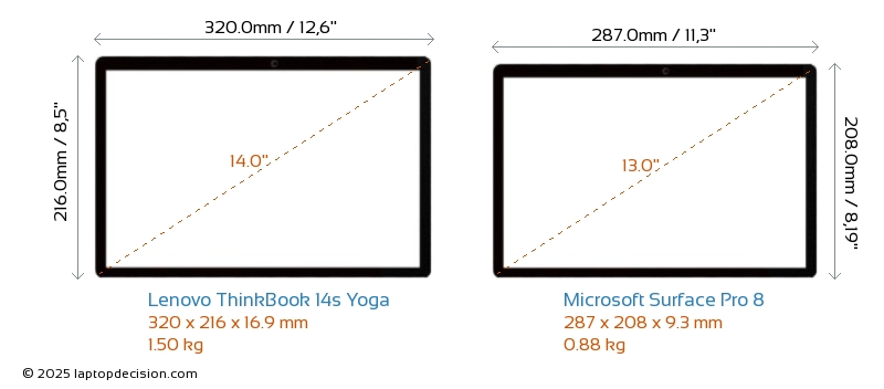 HDMIThinkBook 14s Yoga dispose d'un port HDMI (1x HDMI 2.0) pour se connecter à des moniteurs externes. Surface Pro 8 n'a pas de port HDMI.