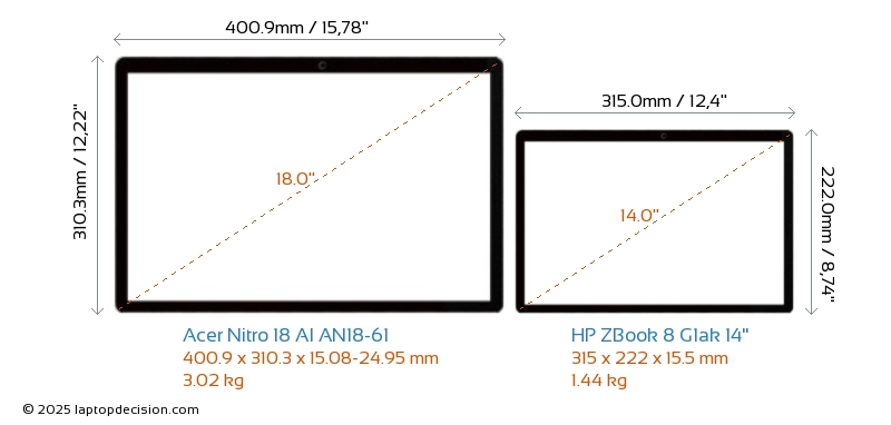 HDMILes deux Nitro 18 AI AN18-61 et ZBook 8 G1ak 14" disposent d'un port HDMI (1x HDMI 2.1) pour se connecter à des moniteurs externes.
