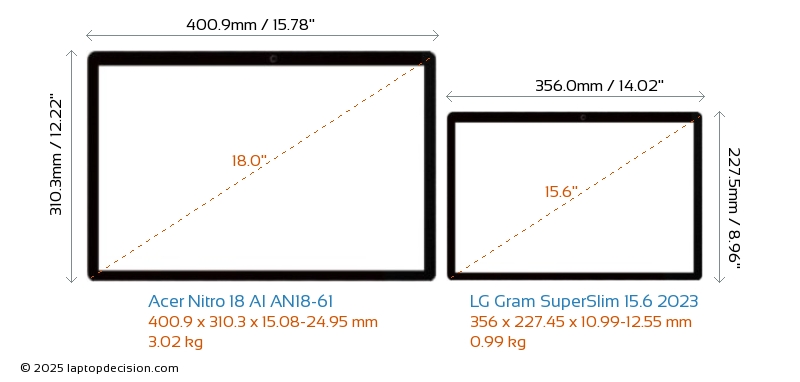 HDMI Nitro 18 AI AN18-61 dispose d'un port HDMI (1x HDMI 2.1) pour se connecter à des moniteurs externes. Gram SuperSlim 15.6 2023 n'a pas de port HDMI.