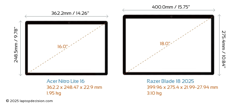 USBLes deux Nitro Lite 16 et Blade 18 2025 disposent de ports USB-A. Nitro Lite 16 dispose de 2x USB 3.2 ports USB-A, tandis que Blade 18 2025 en dispose de 3x USB 3.2.Les deux Nitro Lite 16 et Blade 18 2025 disposent de ports USB Type-C. Nitro Lite 16 dispose de 1x USB 4.0 ports USB Type-C, tandis que Blade 18 2025 en dispose de 2x USB 4.0.