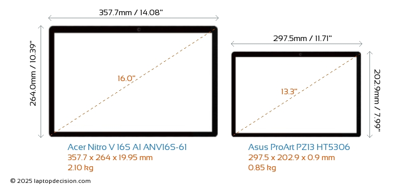 HDMI Nitro V 16S AI ANV16S-61 dispose d'un port HDMI (1x HDMI 2.1) pour se connecter à des moniteurs externes. ProArt PZ13 HT5306 n'a pas de port HDMI.