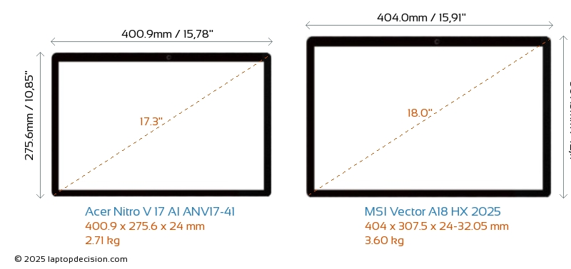 HDMILes deux Nitro V 17 AI ANV17-41 et Vector A18 HX 2025 disposent d'un port HDMI (1x HDMI 2.1) pour se connecter à des moniteurs externes.