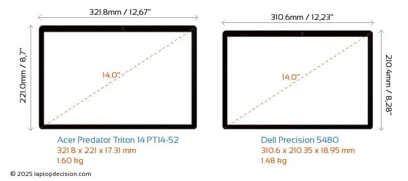 HDMI Predator Triton 14 PT14-52 dispose d'un port HDMI (1x HDMI 2.1) pour se connecter à des moniteurs externes. Precision 5480 n'a pas de port HDMI.