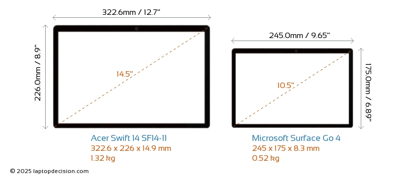 HDMINeither Swift 14 SF14-11 nor Surface Go 4 has an HDMI port for connecting to external monitors. Aucun des deux Swift 14 SF14-11 ni Surface Go 4 n'a de port HDMI pour se connecter à des moniteurs externes.