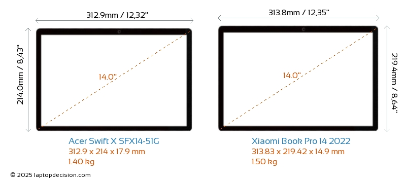 HDMI Swift X SFX14-51G dispose d'un port HDMI (1x HDMI 2.1) pour se connecter à des moniteurs externes. Book Pro 14 2022 n'a pas de port HDMI.