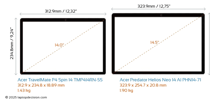 HDMILes deux TravelMate P4 Spin 14 TMP414RN-55 et Predator Helios Neo 14 AI PHN14-71 disposent d'un port HDMI (1x HDMI 2.1) pour se connecter à des moniteurs externes.