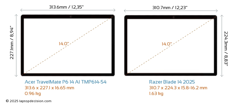 HDMILes deux TravelMate P6 14 AI TMP614-54 et Blade 14 2025 disposent d'un port HDMI (1x HDMI 2.1) pour se connecter à des moniteurs externes.
