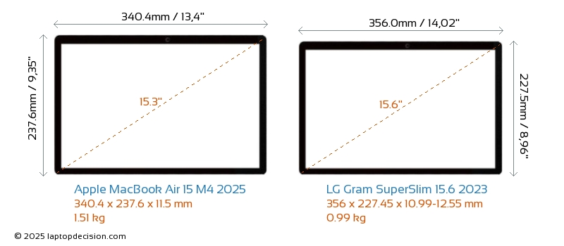 HDMINeither MacBook Air 15 M4 2025 nor Gram SuperSlim 15.6 2023 has an HDMI port for connecting to external monitors. Aucun des deux MacBook Air 15 M4 2025 ni Gram SuperSlim 15.6 2023 n'a de port HDMI pour se connecter à des moniteurs externes.