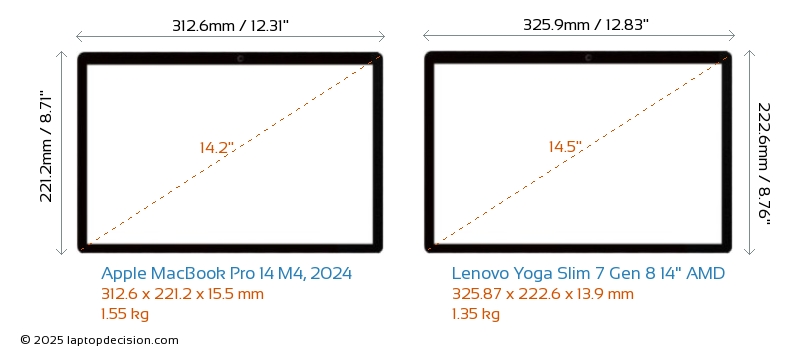Prise AudioLes deux MacBook Pro 14 M4, 2024 et Yoga Slim 7 Gen 8 14" AMD sont équipés d'une prise audio de 3,5 mm, permettant une connexion sans interruption aux écouteurs et haut-parleurs.