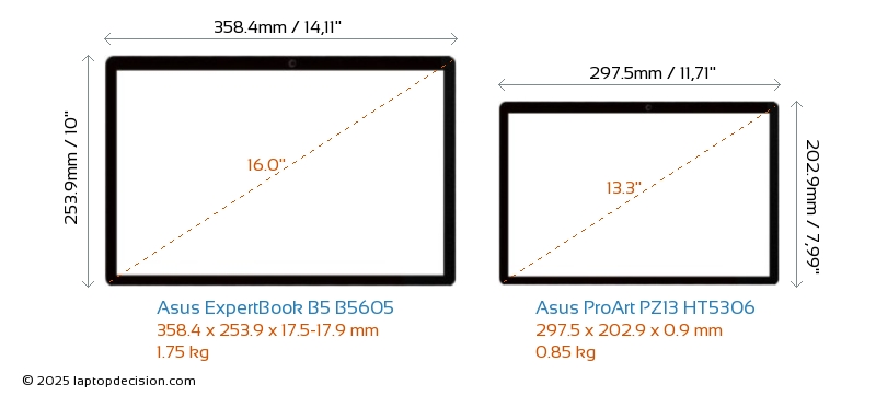 HDMI ExpertBook B5 B5605 dispose d'un port HDMI (1x HDMI 2.1) pour se connecter à des moniteurs externes. ProArt PZ13 HT5306 n'a pas de port HDMI.