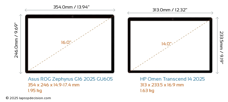 USBLes deux ROG Zephyrus G16 2025 GU605 et Omen Transcend 14 2025 disposent de 2x USB 3.2 ports USB-A.Les deux ROG Zephyrus G16 2025 GU605 et Omen Transcend 14 2025 disposent de 2x USB 4.0 ports USB Type-C.