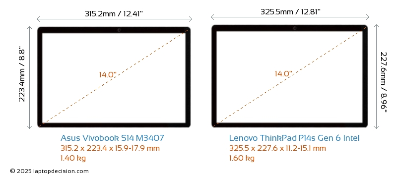 USBLes deux Vivobook S14 M3407 et ThinkPad P14s Gen 6 Intel disposent de 2x USB 3.2 ports USB-A.Les deux Vivobook S14 M3407 et ThinkPad P14s Gen 6 Intel disposent de 2x USB 4.0 ports USB Type-C.
