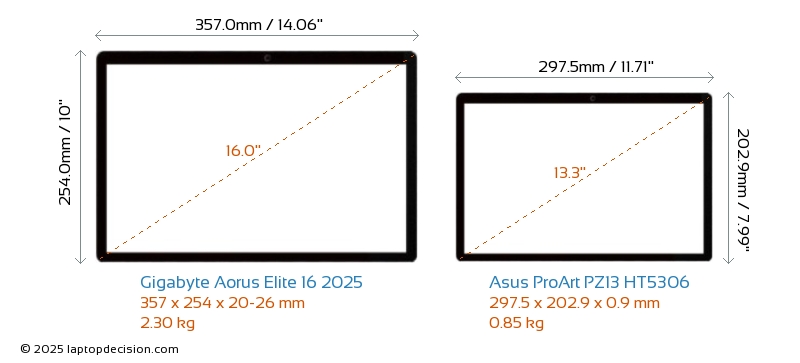 HDMI Aorus Elite 16 2025 dispose d'un port HDMI (1x HDMI 2.1) pour se connecter à des moniteurs externes. ProArt PZ13 HT5306 n'a pas de port HDMI.