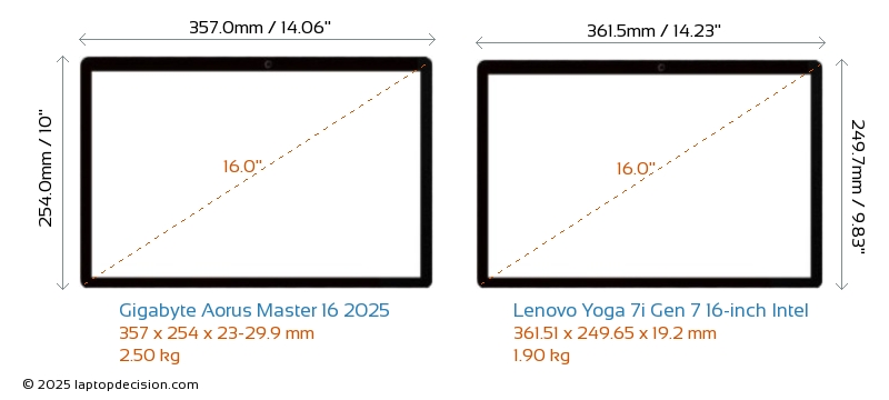 USBLes deux Aorus Master 16 2025 et Yoga 7i Gen 7 16-inch Intel disposent de 2x USB 3.2 ports USB-A.Les deux Aorus Master 16 2025 et Yoga 7i Gen 7 16-inch Intel disposent de 2x USB 4.0 ports USB Type-C.