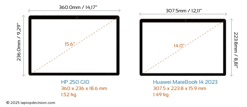 USBLes deux 250 G10 et MateBook 14 2023 disposent de 2x USB 3.2 ports USB-A.Les deux 250 G10 et MateBook 14 2023 disposent de 1x USB 3.2 ports USB Type-C.