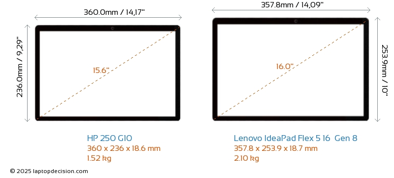HDMILes deux 250 G10 et IdeaPad Flex 5 16 Gen 8 disposent d'un port HDMI (1x HDMI 1.4) pour se connecter à des moniteurs externes.