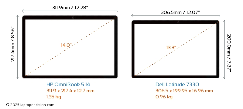 HDMILatitude 7330 dispose d'un port HDMI (1x HDMI 2.0) pour se connecter à des moniteurs externes. OmniBook 5 14 n'a pas de port HDMI.