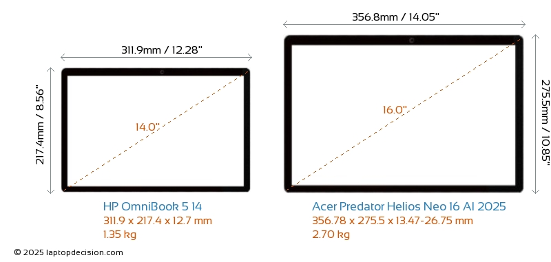 HDMI Predator Helios Neo 16 AI 2025 dispose d'un port HDMI (1x HDMI 2.1) pour se connecter à des moniteurs externes. OmniBook 5 14 n'a pas de port HDMI.