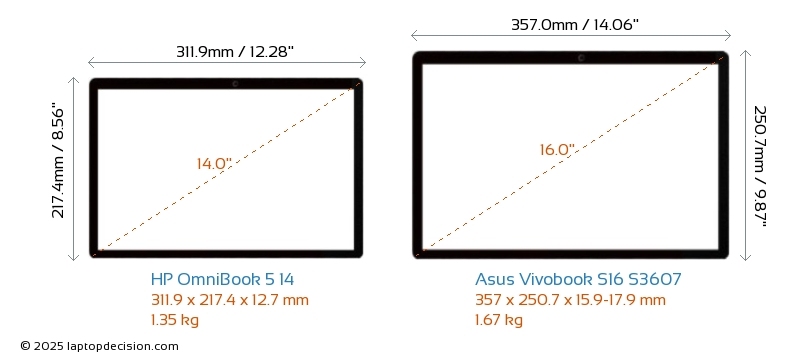 HDMI Vivobook S16 S3607 dispose d'un port HDMI (1x HDMI 2.1) pour se connecter à des moniteurs externes. OmniBook 5 14 n'a pas de port HDMI.
