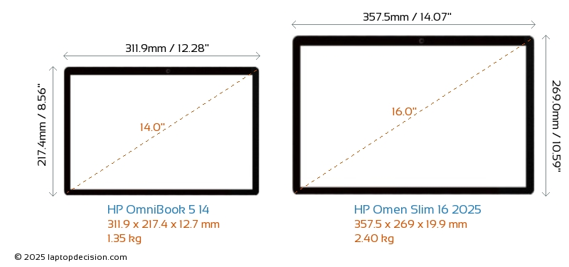 HDMI Omen Slim 16 2025 dispose d'un port HDMI (1x HDMI 2.1) pour se connecter à des moniteurs externes. OmniBook 5 14 n'a pas de port HDMI.